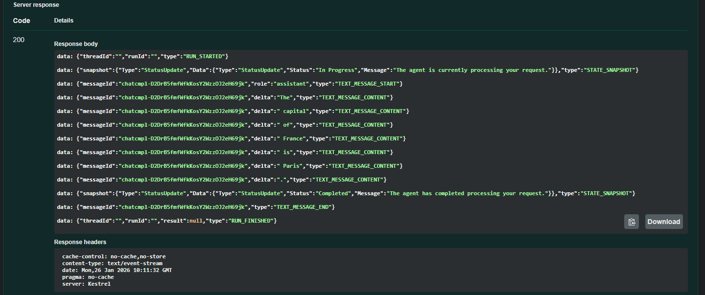 When DataContent is added to the response with a JSON media type, the AG-UI extension converts it into a STATE_SNAPSHOT event, so we can distinguish it from other streaming events.