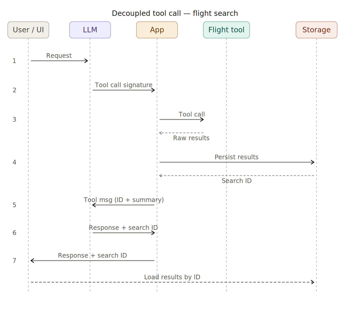 summary.ToString()));By returning only the summary and search ID, these references become part of the conversation history. The LLM can then reference them across subsequent turns without extra effort. For example, if a user says, "Book the second option," the LLM uses the ID already in context to reason against the stored data. The full result set remains in storage for the life of the session, never cluttering the context window again.