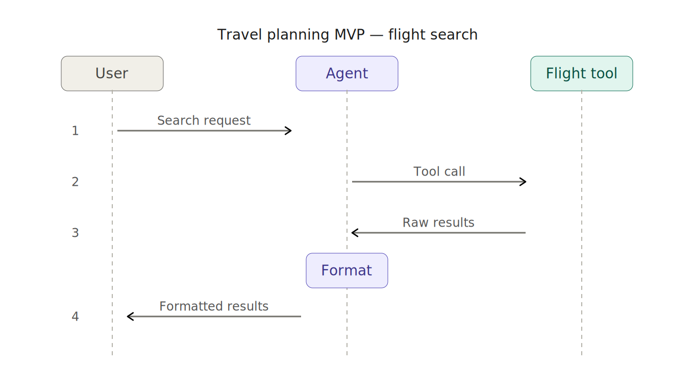A typical agentic MVP involves creating a travel planning agent and providing it with a flight search tool. The user requests a flight search based on input criteria, the agent calls the tool, formats the results and returns them to the user.